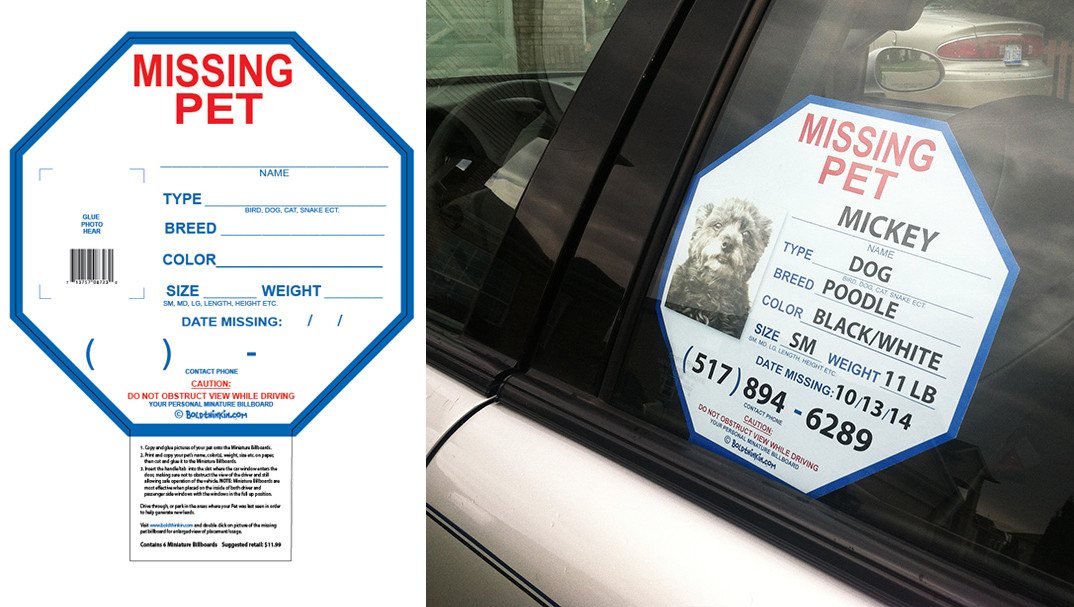 Pet owners can post these Mobile Miniature Billboards in their cars, and then drive through the areas in which their pet was last seen in order to help generate new leads. For usage and preparation, click on; “About US” then scroll down to; “MISSING PET BILLBOARD”.