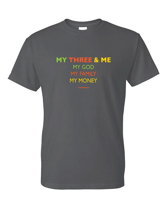 A colorful "MY THREE & ME, MY GOD, MY FAMILY, MY MONEY", on a charcoal, 100% cotton, preshrunk tee.