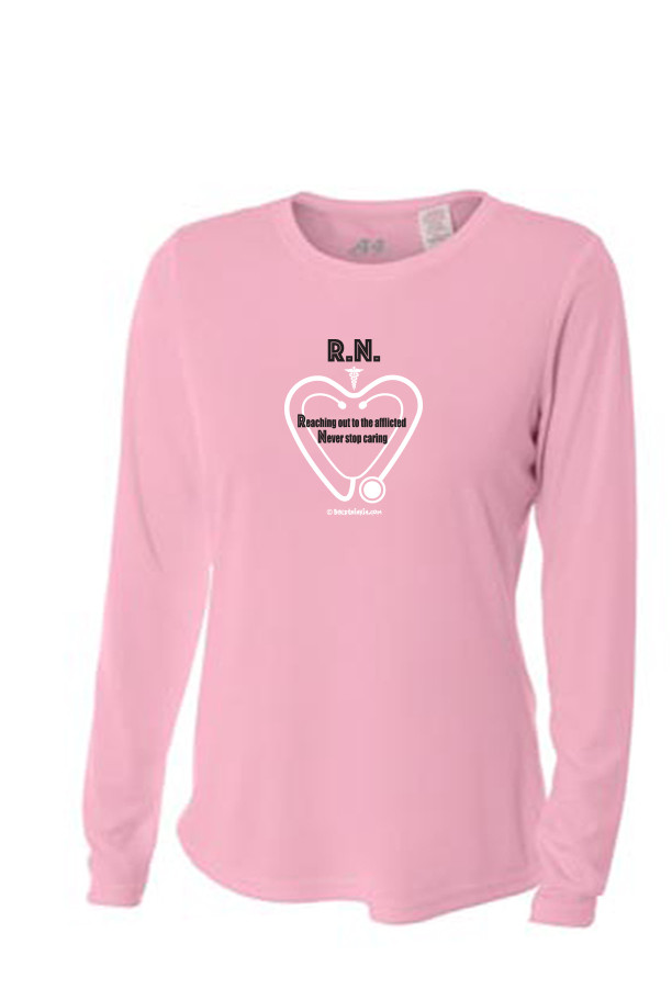 "R.N.: Reaching out to the afflicted, Never stop caring." 4.0 oz., 100% polyester interlock, moisture wicking, odor resistant, stain release and resists snagging. In men’s and lady’s cut.
